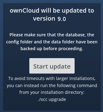 Si vous avez une installation d’ownCloud conséquente et que vous avez un accès au shell, vous devez utiliser la commande occ upgrade, en l’exécutant en tant que votre utilisateur HTTP, au lieu de cliquer sur le bouton de mise à jour, afin d’éviter les dépassements de temps de PHP.
