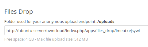 Sur votre page personnelle, vous devriez à présent voir une URL pour le répertoire de téléversement. Partagez cette URL avec vos correspondant pour les autoriser à téléverser dans votre répertoire Files Drop. Dans cet exemple, la taille maximale de téléversement est de 512 Mo. Ceci est paramétrable. Contactez votre administrateur ownCloud si vous avez besoin d’une taille plus importante.